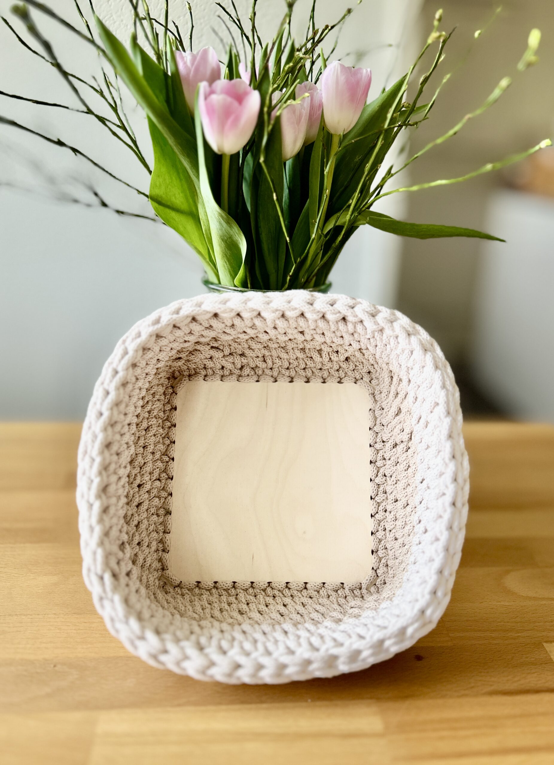 Zweifarbiger gehäkelter Korb mit Holzboden und Farbverlauf in beige